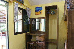 Small comfortable brick built bungalows with all the amenities you need. They have a fridge, kettle, fan, hot water shower, humane toilet with bum washer, mosquito screen on windows, big desk with big mirror for your laptop etc and an open wardrobe with copious hangers.